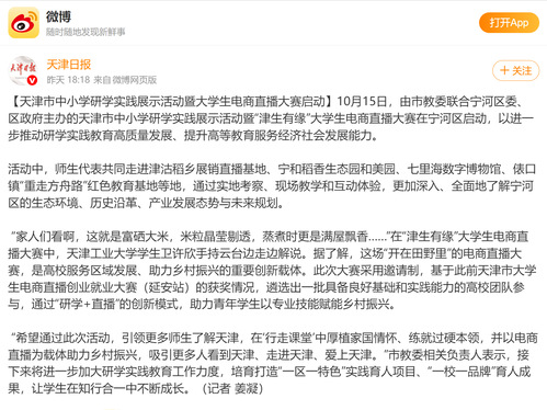 【天津市中小学研学实践展示活动暨大学生电商直播大赛启动】10月15日,由市教委联合宁河区委、区政府主办的天津市中小学研学实践展示活动暨“津生有缘”大学生电商直播大赛在宁河区启动,以进一步推动研学实践教育高质量发展、提升高等教育服务经济社会发展能力。