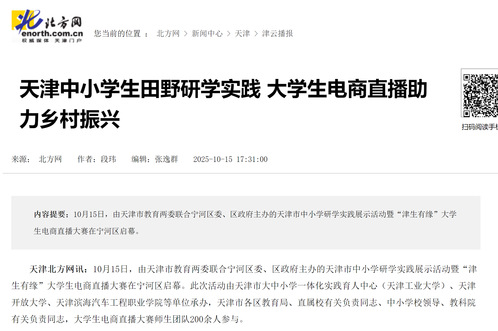 天津北方网讯:10月15日,由天津市教育两委联合宁河区委、区政府主办的天津市中小学研学实践展示活动暨“津生有缘”大学生电商直播大赛在宁河区启幕。此次活动由天津市大中小学一体化实践育人中心(天津工业大学)、天津开放大学、天津滨海汽车工程职业学院等单位承办,天津市各区教育局、直属校有关负责同志、中小学校领导、教科院有关负责同志,大学生电商直播大赛师生团队200余人参与。