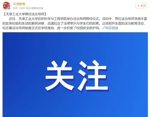 【天津工业大学聘任法治导师】近日,天津工业大学纺织科学与工程学院举办法治导师聘任仪式。活动中,两位法治导师凭借丰富的实务经验和生动的案例讲解,迅速拉近了法律常识与学生们的距离。这场别开生面的法治教育活动,标志着法治导师制度正式在学校落地,进一步织密了校园安全防护网。