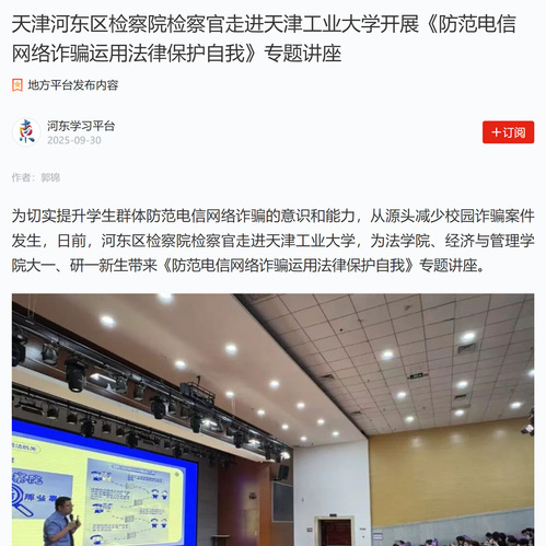 天津河东区检察院检察官走进天津工业大学开展《防范电信网络诈骗运用法律保护自我》专题讲座