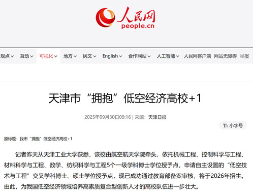 在自设交叉学科方面,天津大学、天津理工大学、天津工业大学新增低空技术与工程交叉学科。其中,天津大学电气自动化与信息工程学院牵头,联合该校多个学院优势学科力量组织申报的“低空技术与工程”一级交叉学科博士学位授权点已正式获批,将于2026年招生,旨在培养具有创新意识、能够支撑低空技术体系和新兴产业发展的高素质复合型人才;天津理工大学自主设置的“低空技术与工程”交叉学科博士学位授权点已成功通过教育部备案审核,本年度就将开展招生工作,重点培养具备跨学科综合能力的低空经济领域高层次创新型人才。(记者 姜凝)