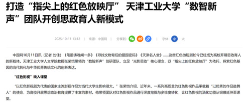 中国网10月11日讯(记者 刘佳)《笔墨铸魂闻一多》《寻找文物背后的爱国密码》《天津名人堂》……这些红色微短剧如今已经成为高校开展思政育人的新载体。天津工业大学人文学院教授张荣恺带领的“数智新声”创研团队,立足“光影思政”核心理念,以“指尖上的红色放映厅”为依托,探索红色基因的当代转化与中华优秀传统文化的创新表达。