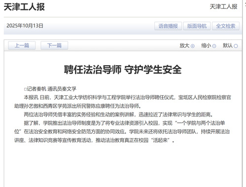 本报讯 日前,天津工业大学纺织科学与工程学院举行法治导师聘任仪式,宝坻区人民检察院检察官助理孙艺傲和西青区学苑派出所民警陈应康聘任为法治导师。