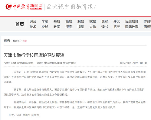 本报讯(记者 徐德明 陈欣然)为切实加强青少年学生国防教育,“纪念中国人民抗日战争暨世界反法西斯战争胜利80周年”天津市学校国旗护卫队展演在天津工业大学举行。此次活动由天津市委宣传部、市教育两委、天津警备区战备建设局等共同承办。