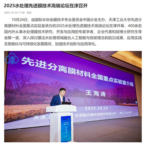 10月24日,由国际水协会膜技术专业委员会中国分会主办、天津工业大学先进分离膜材料全国重点实验室承办的2025水处理先进膜技术高端论坛在津开幕,400余名国内外从事水处理膜技术研究、开发与应用的专家学者、企业代表和硕博士研究生等会聚一堂,深入探讨膜法水处理领域融合人工智能与低碳理念的前沿成果、应用实践及智能化与可持续化发展路径,加速技术创新与应用深化。