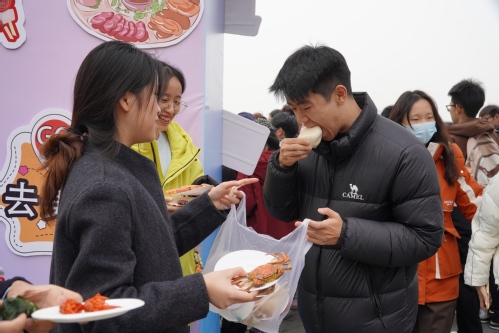 膏满黄肥的大闸蟹、鲜香弹牙的小龙虾、皮脆肉嫩的烤鸭、滋滋冒油的羊肉串,各式花馍等风味全部免费供应。晶莹剔透的糖葫芦裹着薄脆糖衣,刚出炉的烤红薯外皮焦香,热乎乎的糖炒栗子,每一口都是童年记忆里的秋日滋味。与此同时,各食堂内的抽奖活动更是人气爆棚,一次次惊喜开奖让现场欢呼声此起彼伏,同学们在欢声笑语中,传递着校园独有的温情。