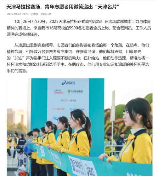 10月26日7点30分,2025天津马拉松正式鸣枪起跑!在这场展现城市活力与体育精神的赛场上,来自我市16所高校的5900名志愿者全员上岗,配合裁判员、工作人员圆满完成各项任务。