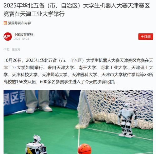 10月26日,2025年华北五省(市、自治区)大学生机器人大赛天津赛区竞赛在天津工业大学如期举行。来自天津大学、南开大学、河北工业大学、天津理工大学、天津科技大学、天津师范大学、天津医科大学、天津市大学软件学院等23所高校的166支队伍、600余名参赛学生进入了今天的决赛比拼。