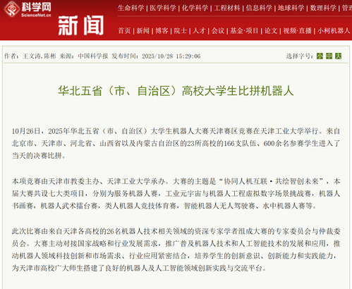 10月26日,2025年华北五省(市、自治区)大学生机器人大赛天津赛区竞赛在天津工业大学举行。来自北京市、天津市、河北省、山西省以及内蒙古自治区的23所高校的166支队伍、600余名参赛学生进入了当天的决赛比拼。