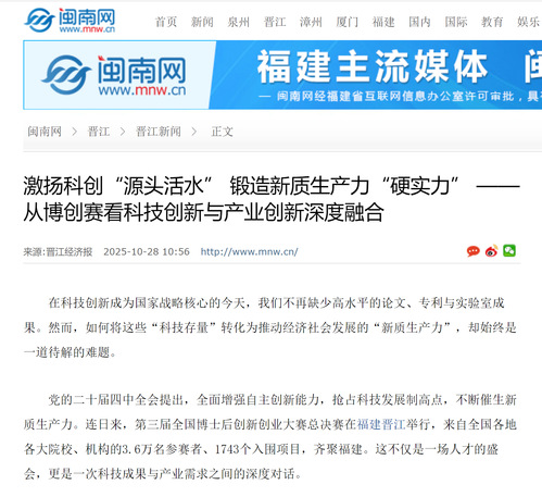 党的二十届四中全会提出,全面增强自主创新能力,抢占科技发展制高点,不断催生新质生产力。连日来,第三届全国博士后创新创业大赛总决赛在福建晋江举行,来自全国各地各大院校、机构的3.6万名参赛者、1743个入围项目,齐聚福建。这不仅是一场人才的盛会,更是一次科技成果与产业需求之间的深度对话。