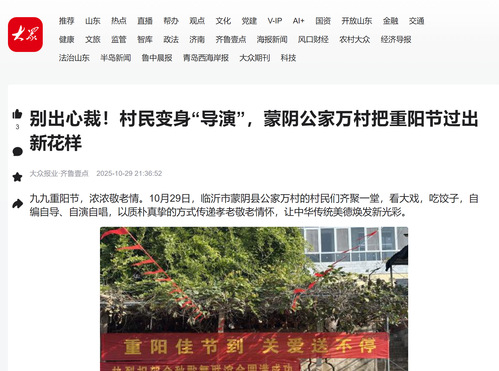 九九重阳节,浓浓敬老情。10月29日,临沂市蒙阴县公家万村的村民们齐聚一堂,看大戏,吃饺子,自编自导、自演自唱,以质朴真挚的方式传递孝老敬老情怀,让中华传统美德焕发新光彩。