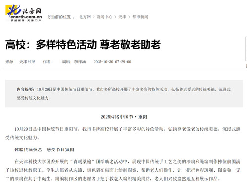 10月29日是中国传统节日重阳节,我市多所高校开展了丰富多彩的特色活动,弘扬尊老爱老的传统美德,沉浸式感受传统文化魅力。