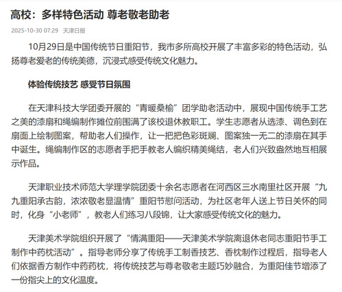 10月29日是中国传统节日重阳节,我市多所高校开展了丰富多彩的特色活动,弘扬尊老爱老的传统美德,沉浸式感受传统文化魅力。