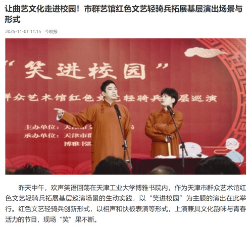 昨天中午,欢声笑语回荡在天津工业大学博雅书院内,作为天津市群众艺术馆红色文艺轻骑兵拓展基层巡演场景的生动实践,以“笑进校园”为主题的演出在此举行。红色文艺轻骑兵创新形式,以相声和快板表演等形式,上演兼具文化韵味与青春活力的节目,现场“笑”果不断。