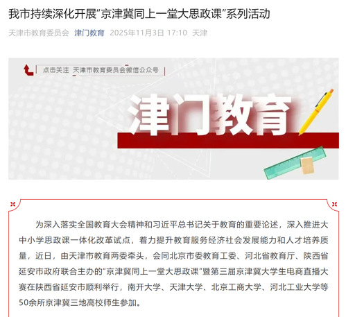 为深入落实全国教育大会精神和习近平总书记关于教育的重要论述,深入推进大中小学思政课一体化改革试点,着力提升教育服务经济社会发展能力和人才培养质量,近日,由天津市教育两委牵头,会同北京市委教育工委、河北省教育厅、陕西省延安市政府联合主办的“京津冀同上一堂大思政课”暨第三届京津冀大学生电商直播大赛在陕西省延安市顺利举行,南开大学、天津大学、北京工商大学、河北工业大学等50余所京津冀三地高校师生参加。