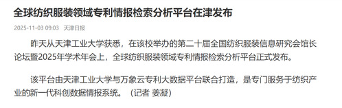 全球纺织服装领域专利情报检索分析平台在津发布昨天从天津工业大学获悉,在该校举办的第二十届全国纺织服装信息研究会馆长论坛暨2025年学术年会上,全球纺织服装领域专利情报检索分析平台正式发布。该平台由天津工业大学与万象云专利大数据平台联合打造,是专门服务于纺织产业的新一代科创数据情报系统。(记者 姜凝)