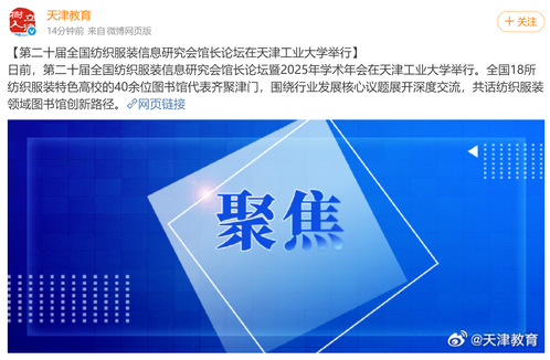 【第二十届全国纺织服装信息研究会馆长论坛在天津工业大学举行】日前,第二十届全国纺织服装信息研究会馆长论坛暨2025年学术年会在天津工业大学举行。全国18所纺织服装特色高校的40余位图书馆代表齐聚津门,围绕行业发展核心议题展开深度交流,共话纺织服装领域图书馆创新路径。