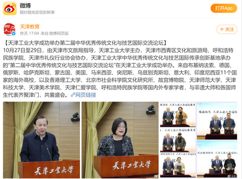 10月27日至29日,由天津市文旅局指导,天津工业大学主办,天津市西青区文化和旅游局、呼和浩特民族学院、天津市礼仪行业协会协办,天津工业大学中华优秀传统文化与技艺国际传承创新基地承办的“第二届中华优秀传统文化与技艺国际交流论坛”在天津工业大学成功举办。来自布基纳法索、德国、俄罗斯、哈萨克斯坦、蒙古国、美国、马来西亚、突尼斯、乌兹别克斯坦、意大利、印度尼西亚11个国家的海外高校,以及香港理工大学、北京市社会科学院文化研究所、故宫博物院、天津师范大学、天津科技大学、天津美术学院、天津仁爱学院、呼和浩特民族学院等国内外专家学者,与非遗大师和各国师生代表齐聚津门,共襄盛会。