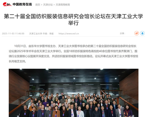 10月31日,由东华大学图书馆主办、天津工业大学图书馆承办的第二十届全国纺织服装信息研究会馆长论坛暨2025年学术年会在天津工业大学举行。全国18所纺织服装特色高校的40余位图书馆代表齐聚津门,围绕行业发展核心议题展开深度交流,共话纺织服装领域图书馆创新路径。论坛开幕式由天津工业大学图书馆馆长尚绪芝主持。