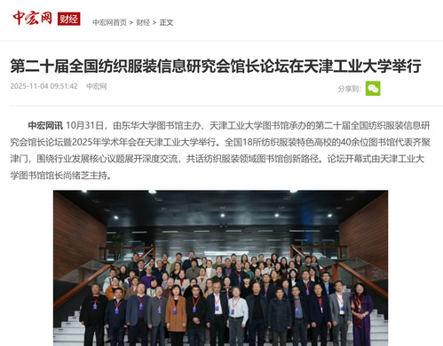 中宏网讯 10月31日,由东华大学图书馆主办、天津工业大学图书馆承办的第二十届全国纺织服装信息研究会馆长论坛暨2025年学术年会在天津工业大学举行。全国18所纺织服装特色高校的40余位图书馆代表齐聚津门,围绕行业发展核心议题展开深度交流,共话纺织服装领域图书馆创新路径。论坛开幕式由天津工业大学图书馆馆长尚绪芝主持。