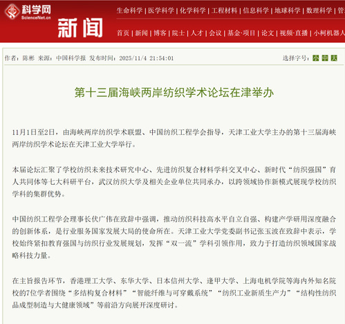 11月1日至2日,由海峡两岸纺织学术联盟、中国纺织工程学会指导,天津工业大学主办的第十三届海峡两岸纺织学术论坛在天津工业大学举行。