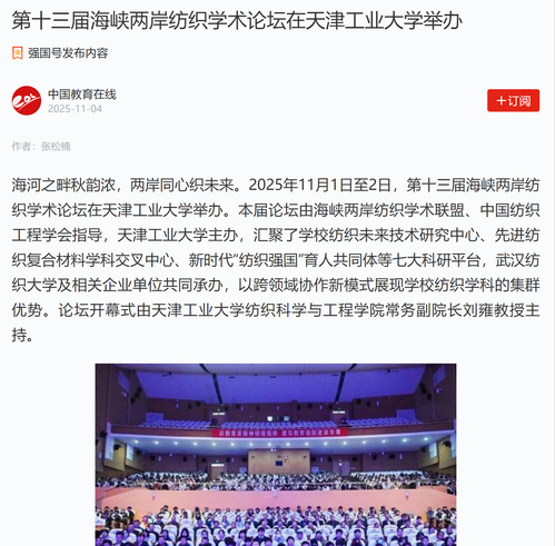 海河之畔秋韵浓,两岸同心织未来。2025年11月1日至2日,第十三届海峡两岸纺织学术论坛在天津工业大学举办。本届论坛由海峡两岸纺织学术联盟、中国纺织工程学会指导,天津工业大学主办,汇聚了学校纺织未来技术研究中心、先进纺织复合材料学科交叉中心、新时代“纺织强国”育人共同体等七大科研平台,武汉纺织大学及相关企业单位共同承办,以跨领域协作新模式展现学校纺织学科的集群优势。论坛开幕式由天津工业大学纺织科学与工程学院常务副院长刘雍教授主持。