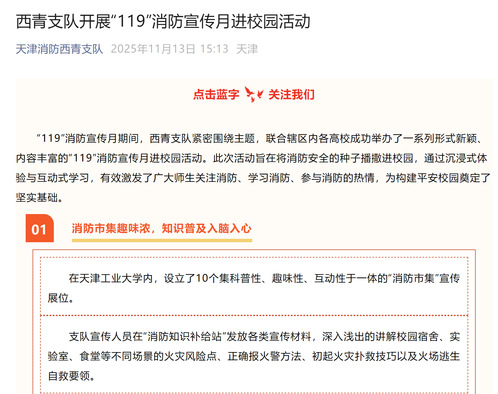 “119”消防宣传月期间,西青支队紧密围绕主题,联合辖区内各高校成功举办了一系列形式新颖、内容丰富的“119”消防宣传月进校园活动。此次活动旨在将消防安全的种子播撒进校园,通过沉浸式体验与互动式学习,有效激发了广大师生关注消防、学习消防、参与消防的热情,为构建平安校园奠定了坚实基础。