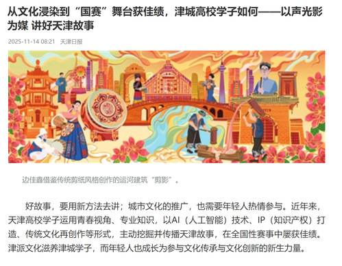 好故事,要用新方法去讲;城市文化的推广,也需要年轻人热情参与。近年来,天津高校学子运用青春视角、专业知识,以AI(人工智能)技术、IP(知识产权)打造、传统文化再创作等形式,主动挖掘并传播天津故事,在全国性赛事中屡获佳绩。津派文化滋养津城学子,而年轻人也成长为参与文化传承与文化创新的新生力量。