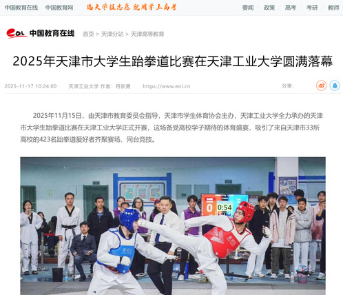 2025年11月15日,由天津市教育委员会指导,天津市学生体育协会主办,天津工业大学全力承办的天津市大学生跆拳道比赛在天津工业大学正式开赛,这场备受高校学子期待的体育盛宴,吸引了来自天津市33所高校的423名跆拳道爱好者齐聚赛场、同台竞技。