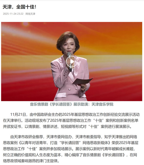 由天津市政研会推荐,天津市委网信办、天津市教委指导,知乎天津推出的网络思政案例《以青年对话青年,打造“学长请回答”网络思政新载体》荣获2025年基层思想政治工作“十佳”案例并参加现场展示。展示案例以新时代青年破解成长难题,树立正确的价值观和人生态度为蓝本,精心编排了音乐情景剧《学长请回答》,在网络思政领域奏响激昂的津门主旋律。