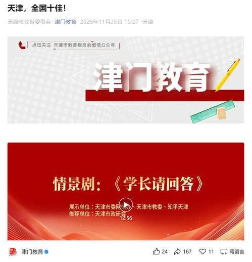 由天津市政研会推荐,天津市委网信办、天津市教委指导,知乎天津推出的网络思政案例《以青年对话青年,打造“学长请回答”网络思政新载体》荣获2025年基层思想政治工作“十佳”案例并参加现场展示。展示案例以新时代青年破解成长难题,树立正确的价值观和人生态度为蓝本,精心编排了音乐情景剧《学长请回答》,在网络思政领域奏响激昂的津门主旋律。