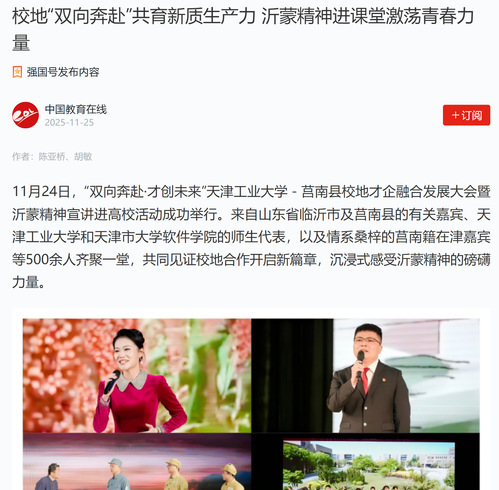 本次天津工业大学与莒南县的全面携手,成功构建了人才、技术、产业、文化等多要素高效流动的立交桥,生动诠释了新时代校地合作从“资源对接”到“价值共创”的路径,为探索区域协同创新、培育新质生产力作出新的贡献。