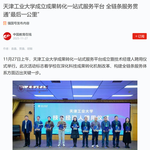 11月27日上午,天津工业大学成果转化一站式服务平台成立暨技术经理人聘用仪式举行。此次活动标志着学校在深化科技成果转化机制改革、构建全链条服务体系方面迈出关键一步。