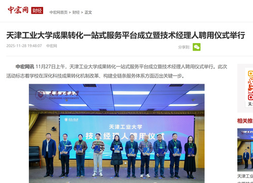 中宏网讯 11月27日上午,天津工业大学成果转化一站式服务平台成立暨技术经理人聘用仪式举行。此次活动标志着学校在深化科技成果转化机制改革、构建全链条服务体系方面迈出关键一步。