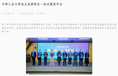央广网天津11月30日消息(记者韩雨晨)日前,天津工业大学成果转化一站式服务平台成立暨技术经理人聘用仪式举行。此次活动标志着天津工业大学在深化科技成果转化机制改革、构建全链条服务体系方面迈出关键一步。