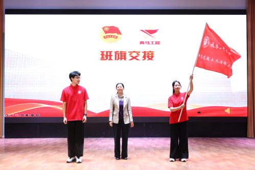 仪式在第八期学员的学习回顾视频中拉开序幕。学员代表以主题朗诵《青春印记·青马答卷》,生动讲述了在理论学习、实践锻炼中的成长与收获。随后,领导小组相关负责同志为第八期优秀学员颁发证书,并向第九期培训班授班旗、为学员代表佩戴班徽。