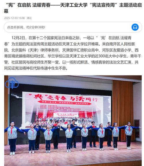 12月2日,在第十二个国家宪法日来临之际,一场以“‘宪’在启航 法耀青春”为主题的宪法宣传周主题活动在天津工业大学拉开帷幕。来自南开区人民检察院、北京盈科(天津)律师事务所、天津国华汇德职业高中、河东区友爱道小学、西青区精武镇格调松间社区、华兰学校以及天津工业大学的近300名大中小学生、青年干警、社区居民与高校师生齐聚一堂,以一场形式鲜活、情感真挚的法治文艺汇演,共同见证宪法精神在代际传递中生生不息。