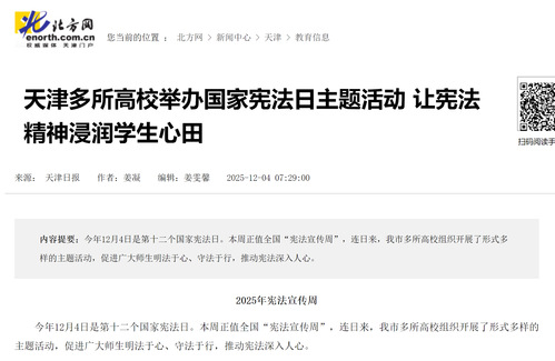今年12月4日是第十二个国家宪法日。本周正值全国“宪法宣传周”,连日来,我市多所高校组织开展了形式多样的主题活动,促进广大师生明法于心、守法于行,推动宪法深入人心。