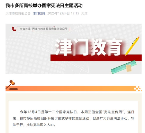 今年12月4日是第十二个国家宪法日。本周正值全国“宪法宣传周”,连日来,我市多所高校组织开展了形式多样的主题活动,促进广大师生明法于心、守法于行,推动宪法深入人心。