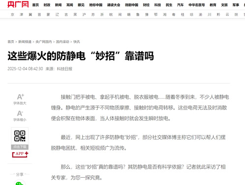 最近,网上出现了许多防静电“妙招”,部分社交媒体博主称它们可以帮人们摆脱静电困扰,相关短视频广为流传。