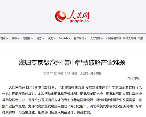 人民网沧州12月6日电 12月5日,“汇聚海归新力量 发展新质生产力”专家助企燕赵行(沧州站)活动在沧州举办。本次活动由河北省委统战部、河北欧美同学会、河北省劳动人事仲裁学会等单位联合主办,旨在充分发挥海归人才的专业优势与国际视野,精准对接沧州产业发展需求,破解产业技术瓶颈,为河北高质量发展注入强劲“海归动能”。河北欧美同学会携多位顶尖海归专家齐聚狮城,与当地企业、相关部门负责人共话合作、共商发展。