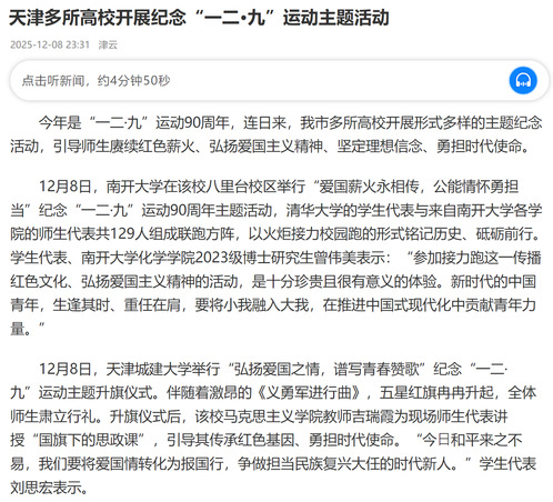12月8日,南开大学在该校八里台校区举行“爱国薪火永相传,公能情怀勇担当”纪念“一二·九”运动90周年主题活动,清华大学的学生代表与来自南开大学各学院的师生代表共129人组成联跑方阵,以火炬接力校园跑的形式铭记历史、砥砺前行。学生代表、南开大学化学学院2023级博士研究生曾伟美表示:“参加接力跑这一传播红色文化、弘扬爱国主义精神的活动,是十分珍贵且很有意义的体验。新时代的中国青年,生逢其时、重任在肩,要将小我融入大我,在推进中国式现代化中贡献青年力量。”