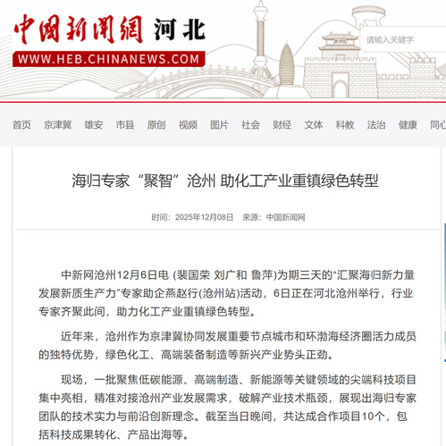 中新网沧州12月6日电 (裴国荣 刘广和 鲁萍)为期三天的“汇聚海归新力量 发展新质生产力”专家助企燕赵行(沧州站)活动,6日正在河北沧州举行,行业专家齐聚此间,助力化工产业重镇绿色转型。