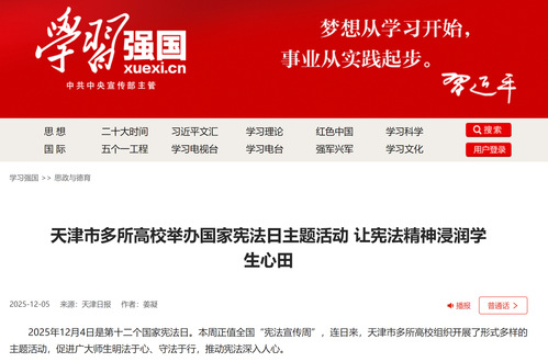 2025年12月4日是第十二个国家宪法日。本周正值全国“宪法宣传周”,连日来,天津市多所高校组织开展了形式多样的主题活动,促进广大师生明法于心、守法于行,推动宪法深入人心。