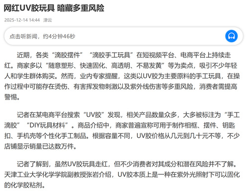 记者了解到,虽然UV胶玩具走红,但不少消费者对其成分和潜在风险并不了解。天津工业大学化学学院副教授张岩介绍,UV胶本质上是一种在紫外光照射下可以固化的化学胶粘剂。
