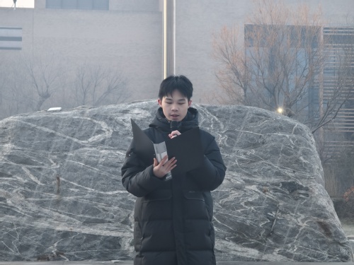 随后,材料科学与工程学院学生代表、高分子2202班的肖晨同学作国旗下发言。他从“勤学不辍,筑牢报国根基”、“笃行科研,勇攀创新高峰”、“躬身实践,彰显青年本色”三个维度,分享了如何将“小我”融入“大我”的思考与实践,呼吁同学们以理想信念为指引,以勤学实践为支撑,将青春汗水挥洒在报国为民的征程上。