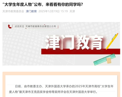 日前,由市教委主办、天津外国语大学承办的2025年天津市高校“大学生年度人物”暨天津市王克昌奖学金特等奖终评会在天津外国语大学举行。