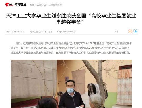近日,教育部高校学生司(高校毕业生就业服务司)公布了2024-2025年度全国“高校毕业生基层就业卓越奖学(教)金”获奖人选名单,天津工业大学纺织科学与工程学院2020届博士毕业生刘永胜入选,这是天津工业大学毕业生连续第三年获此殊荣,充分彰显了学校育人工作的扎实成效和毕业生扎根基层的责任担当。