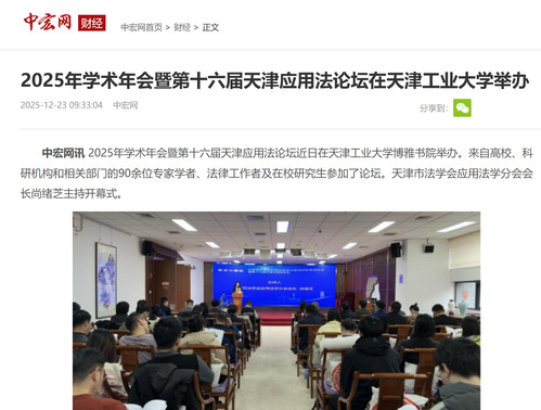 中宏网讯 2025年学术年会暨第十六届天津应用法论坛近日在天津工业大学博雅书院举办。来自高校、科研机构和相关部门的90余位专家学者、法律工作者及在校研究生参加了论坛。天津市法学会应用法学分会会长尚绪芝主持开幕式。