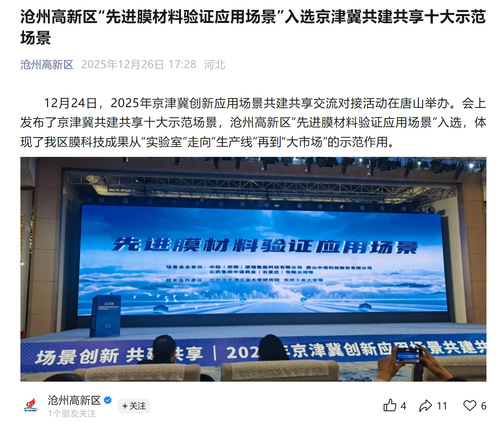 12月24日,2025年京津冀创新应用场景共建共享交流对接活动在唐山举办。会上发布了京津冀共建共享十大示范场景,沧州高新区“先进膜材料验证应用场景”入选,体现了我区膜科技成果从“实验室”走向“生产线”再到“大市场”的示范作用。